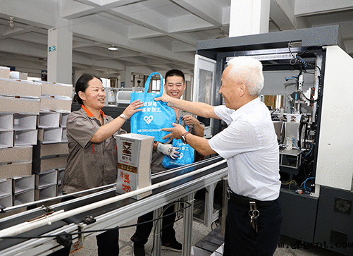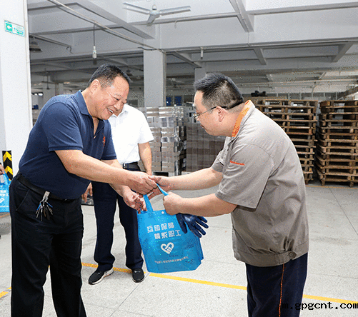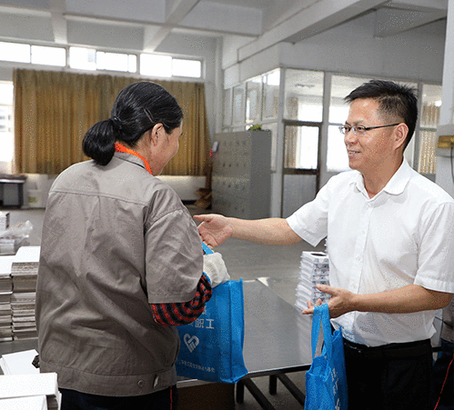 杨兴国首先来到彩印分公司生产车间,看望了奋战在生产一线的员工,向他们送上毛巾等防暑降温物品,在炎炎夏日为大家带来一股清凉。杨兴国叮嘱员工们在坚守岗位、做好工作的同时,要树牢安全意识、加强劳动保护,注意防暑降温和疫情防控。