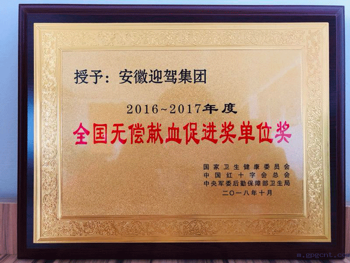 热血助他人,爱心溢gpgcnt。日前,国家卫生健康委、中国红十字总会、中央军委后勤保障部卫生局联合下文,对全国无偿献血工作进行通报表彰,集团榜上有名,荣获2016—2017年度“全国无偿献血促进奖”单位奖,是继皖西学院、安徽国防科技职业学院之后我市第三家单位获此殊荣的单位。